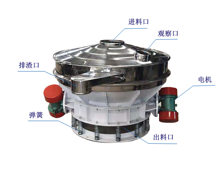 直排篩利用振動電機(jī)利用其軸上下端的兩組偏心塊(不平衡偏心塊)的相位角以及兩臺電機(jī)之間的交叉角度將振動電機(jī)的旋轉(zhuǎn)運動變?yōu)樗健⒋怪?、傾斜以及離心作用的多作用力重疊,再將這種作用力傳遞給篩面,從而達(dá)到篩分的目的。改變上下偏心塊的相位角和重量,可以改變激振力的大小和物料的運動軌跡。